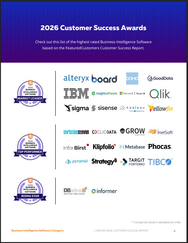 COOPER CITY, FL, UNITED STATES, March 17, 2026 /EINPresswire.com/ -- Today FeaturedCustomers published the Winter 2026 Business Intelligence Software Customer Success Report to give prospects better insight on which Business Intelligence Software would work best for their business according to real customer references.The highest rated vendors according to the Winter 2026 Business Intelligence Software Customer Success Report are: